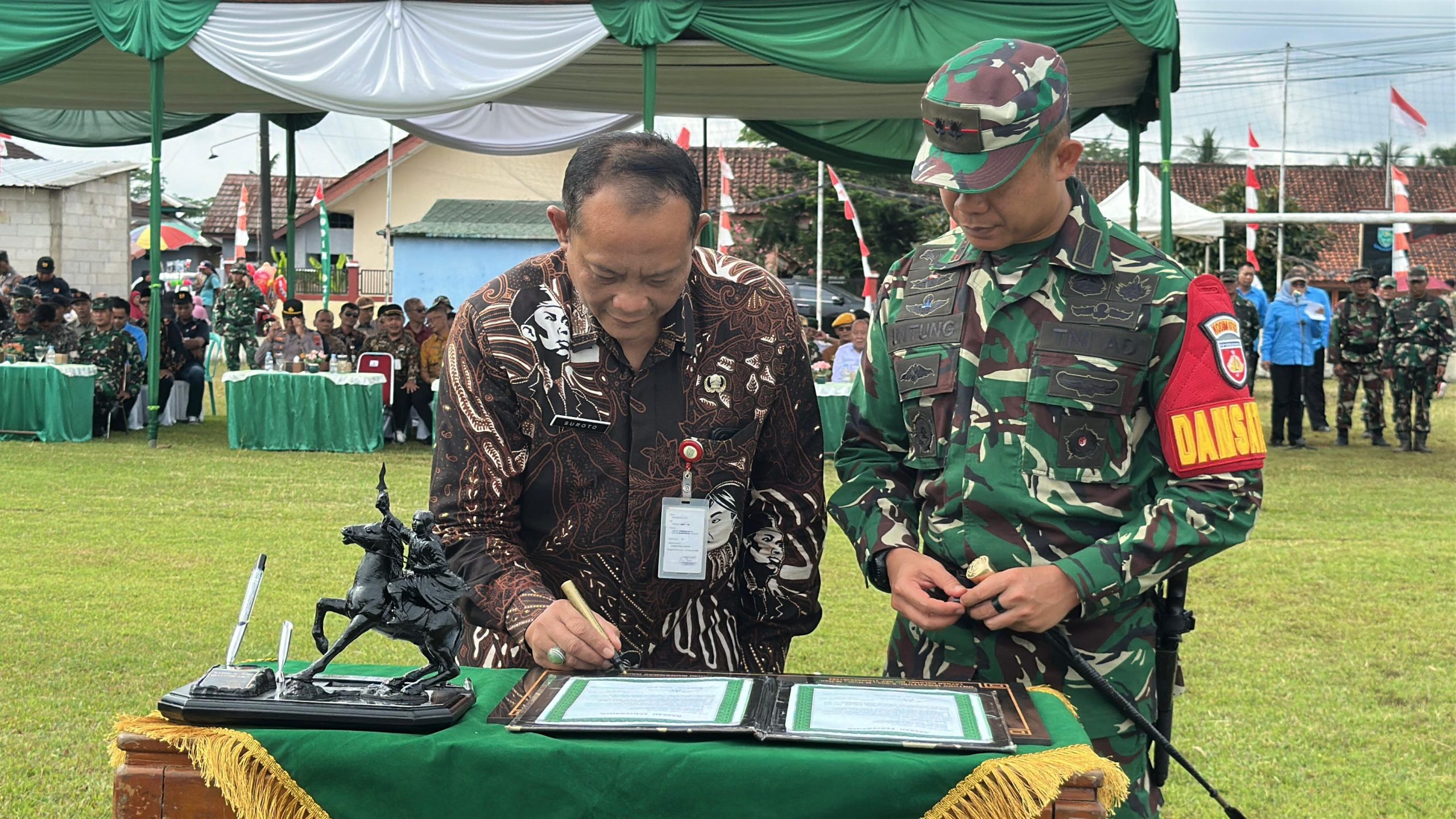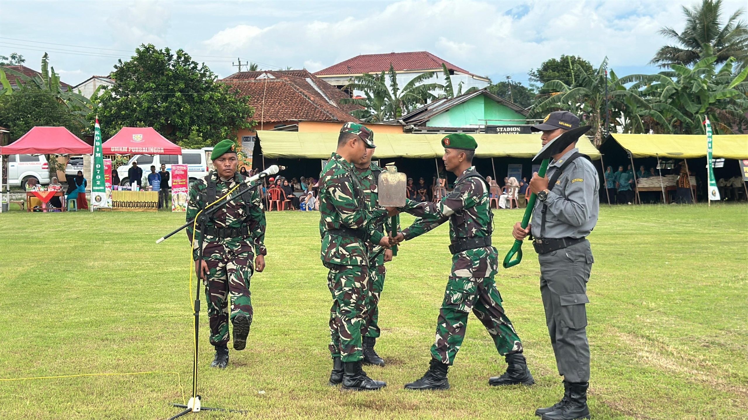 Upacara penutupan TMMD berlangsung di Lapangan Desa Kradenan, Kecamatan Mrebet, diikuti jajaran TNI, Polri, pelajar, ormas, dan masyarakat setempat. Suasana upacara berlangsung khidmat dan penuh semangat gotong royong, mencerminkan kuatnya kemitraan antara TNI dan rakyat.