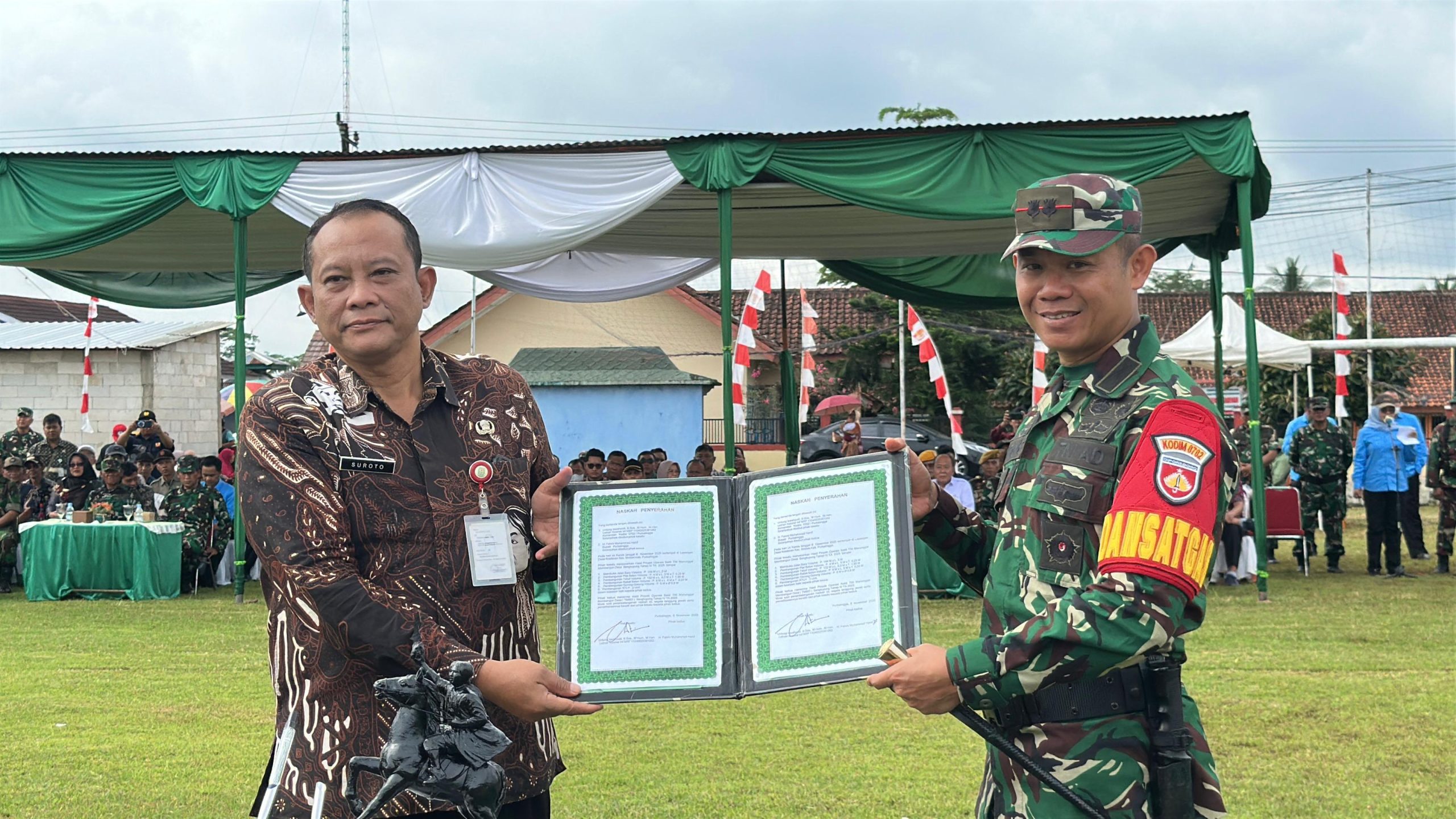 Upacara penutupan TMMD berlangsung di Lapangan Desa Kradenan, Kecamatan Mrebet, diikuti jajaran TNI, Polri, pelajar, ormas, dan masyarakat setempat. Suasana upacara berlangsung khidmat dan penuh semangat gotong royong, mencerminkan kuatnya kemitraan antara TNI dan rakyat.